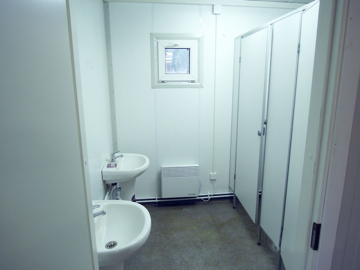 Модульное санитарное здание 19,48 м х12,1 м х5,14 м построение 16 из блок-контейнеров 6,05 х 2,435 х 2,75 м, оборудовано общей кровлей и внутренними инженерными системами: электрикой, отоплением, водоснабжением, канализацией, сантехническим оборудованием и пожарной сигнализацией.