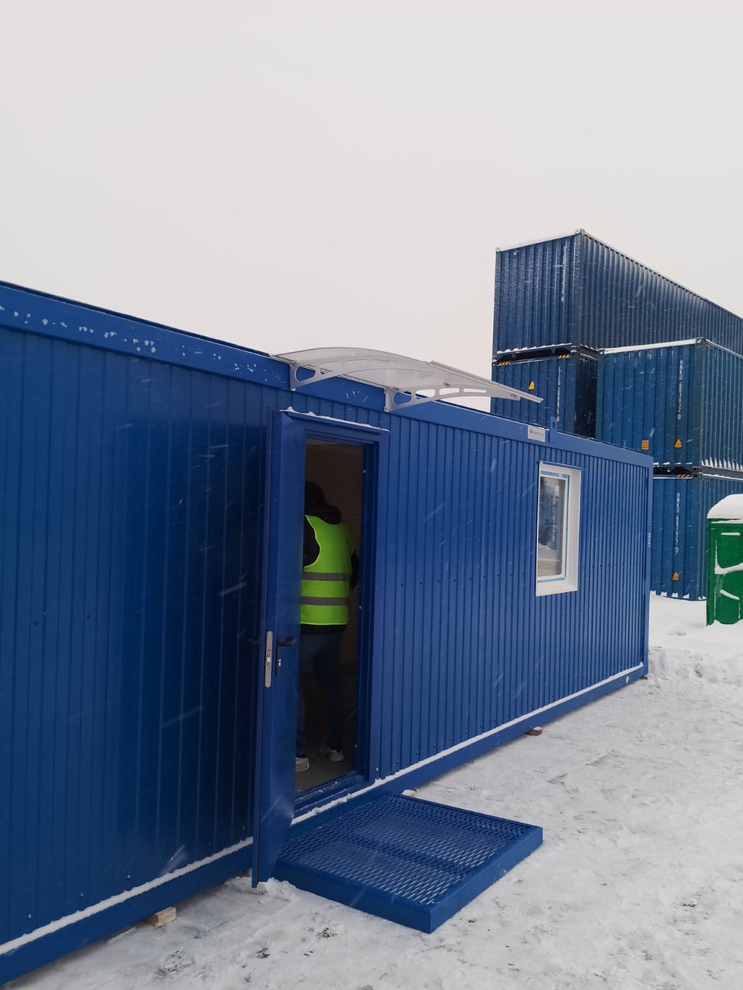 Окна – ПВХ 900×1100 мм с двухкамерными стеклопакетами и поворотно-откидными створками, обеспечивающими вентиляцию и естественное освещение. Входная дверь – металлическая утеплённая 2050×860 мм, окрашенная в цвет корпуса. Внутренние двери – офисные белые, 2010×800 мм, с замками и ручками.