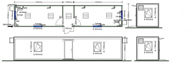 Офисный модуль – это одноэтажное здание площадью 29,16 м² (12 × 2,43 × 2,6 м), выполненное на базе прочного стального блок-контейнера. Конструкция спроектирована по планировке «распашонка» и включает два отдельных помещения, что удобно для размещения тальмана. Модуль поставляется в полной заводской готовности, включая внутреннюю отделку, инженерные системы и элементы входной группы.
