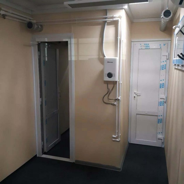 В блок-контейнере выполнено утепление стен, потолка и пола 80-100мм, а также установлены входные и межкомнатные двери, перегородки. Внутренняя отделка стен и потолка - фанера 10 мм, на пол уложено резиновое покрытие. Снаружи корпус санпропускника окрашен в цвет RAL 7004.