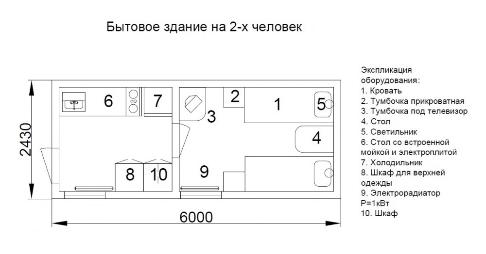 Габариты здания данной типовой планировки — 6,0 х 2,43 х 2,59 м. Возможно изменение габаритов по вашему требованию.
